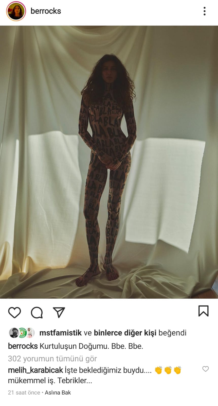 Bu fotoğrafın bir kaç günün ardından tüm vücuduna yüzü haricinde yazılmış Bla Bla yazılmış çırılçıplak fotoğraflarının altında "özgürlüğün doğumu. Bbe"