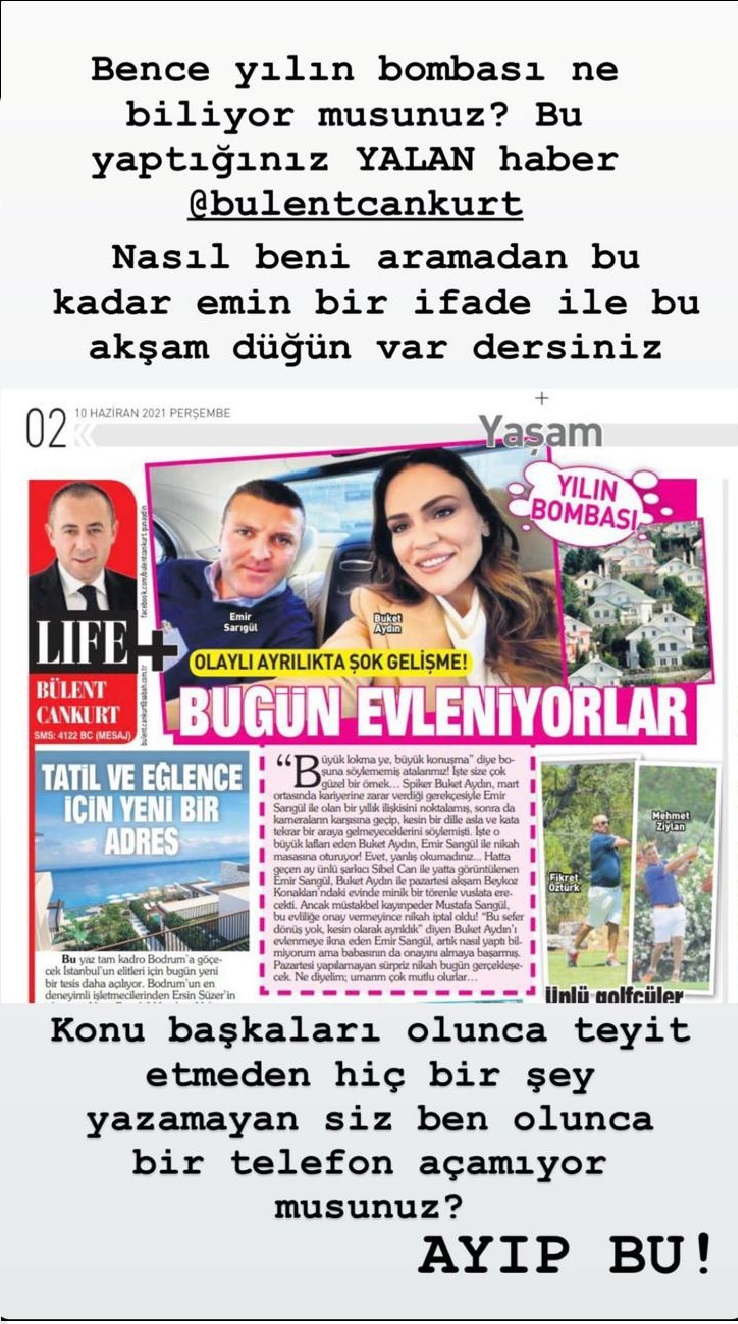 Bir yıllık ilişkisini bitirerek Emir Sarıgül’den ayrılan ancak evleneceğini gazeteden öğrenen ünlü sunucu Buket Aydın sosyal medya hesabı Instagram’dan şu cümlelerle isyan etti: “Bence yılın bombası ne biliyor musunuz? Bu yaptığınız YALAN haber @bulentcankurt Nasıl beni aramadan bu kadar emin bir ifade ile bu akşam düğün var dersiniz. Konu başkaları olunca teyit etmeden hiç bir şey yazamayan siz ben olunca bir telefon açamıyor musunuz? AYIP BU!”
