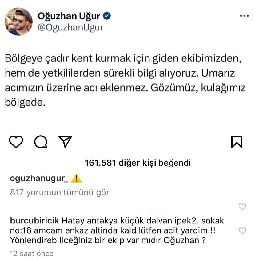 Ahbab Derneği ve Haluk Levent ile ortaklaşa olarak depremzedelere yardım ulaştırmaya çalışan Babala TV sahibi Oğuzhan Uğur “Bölgeye çadır kent kurmak için giden ekibimizden hem de yetkililerden sürekli bilgi alıyoruz. Umarız acımızın üzerine acı eklenmez. Gözümüz kulağımız bölgede.” şeklinde ywitter hesabından paylaşımda bulundu. Bu paylaşımın altına Burcu Biricik ; “ Hayat Antakya Küçük Dalyan 2. Sok. No : 16. Amcam enkaz altında kaldı. Lütfen acil yardım!!! Yönlendirebileceğiniz bir ekip var mıdır Oğuzhan?” şeklinde yorum yaparak enkaz altında kalan amcası için yardım istedi..jpg)