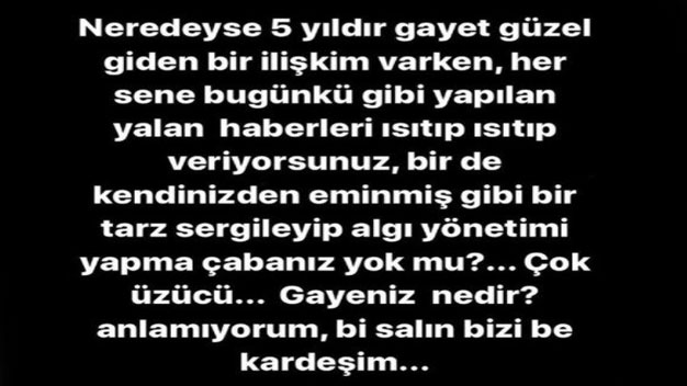 Ünlü isim Çağatay Ulusoy hakkında Serenay Sarıkaya ile çıkan iddialara sosyal medya hesabından tepki gösterdi ve bu iddiaları yalanladı. Çağatay Ulusoy paylaşımında “neredeyse 5 yıldır gayet güzel giden bir ilişkim varken, her sene bugünkü gibi yapılan yalan haberleri ısıtıp ısıtıp veriyorsunuz, bi de kendinizden eminmiş gibi bir tarz sergileyip algı yönetimi çabanız yok mu?! Çok üzücü… Gayeniz nedir? Anlamıyorum bir salın bizi be kardeşim” ifadelerini kullandı. Bu paylaşım kısa sürede sosyal medyada en çok okunanlar listesine girerken Çağatay Ulusoy’da hakkında çıkan iddialara yanıt vererek ilk elden önlem almış ve gerçeği sevenleriyle paylaşmış oldu. Bakalım bu paylaşım ve açıklama sonrası iddialar devam mı edecek yoksa bitecek mi?