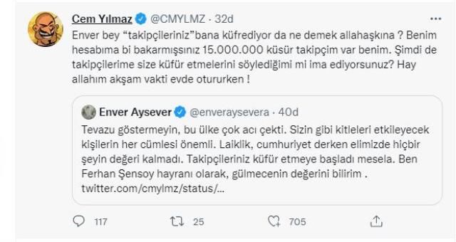 Gazeteci Enver Aysever, oldum olası aralarının bozuk olduğu Rüstem Batum'un programına katılan Cem Yılmaz'ın paylaşımına tepki gösterdi. Rüstem Batum'un programına katılan Cem Yılmaz'a " Zaman size de acı yaşatmaz umarım" diyerek tepki gösterdi. Enver Aysever'in tepkisine aldırış etmeyen Cem Yılmaz, gazetecinin defalarca twet atması üzerine cevap vermekte gecikmedi. Tartışma uzadı ve Aysever sosyal medyadan çok küfür aldığını söyledi. Cem Yılmaz'ın sertçe karşılık vermesi üzerine ona laf yetiştiremeyen Enver Aysever'in son hamlesi Twitter hesabını kilitlemek oldu.