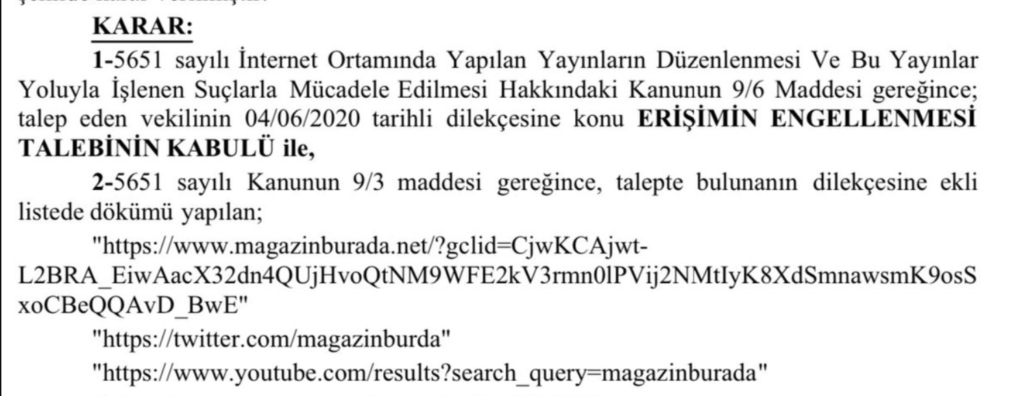 Önümüzdeki günlerde MagazinBurada.net'in ilgili haberlerine erişim engeli getirilmesi bekleniyor.