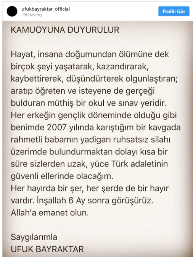 Cezaevine giren Ufuk Bayraktar'dan sevenlerine mesaj
