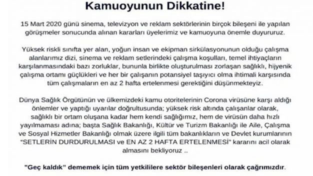 Ülkemizde coronavirüs etkileri ve yansımaları her geçen gün artıyor. Birçok sektörde tedbirler alınırken dizi ve sinema sektörü de tedbir alanlar arasına girdi. On iki sendika ve dernek coronavirüs nedeniyle dizi ve film setlerine 2 hafta ara verilmesi talebiyle harekete geçti. Sendika ve derneklerin imzacısı olduğu açıklamada “geç kaldık dememek için tüm yetkililere sektör bileşenleri olarak çağrımızdır” başlığı altında bir bildiri yayınlandı. Bildiride “yüksek riskli sınıfta yer alan, yoğun insan ve ekipman sirkülasyonunun olduğu çalışma alanlarımız dizi, sinema ve reklam setlerindeki çalışma koşulları, temel ihtiyaçların karşılanmasındaki bazı zorluklar, bununla birlikte oluşturulması zorlaşan sağlıkla, hijyenik çalışma ortamı güçlükler ve her bir çalışanın potansiyel taşıyıcı olma ihtimali karşısında tüm çalışmaların en az 2 hafta ertelenmesi gerektiğini düşünmekteyiz” ifadelerine yer verildi.