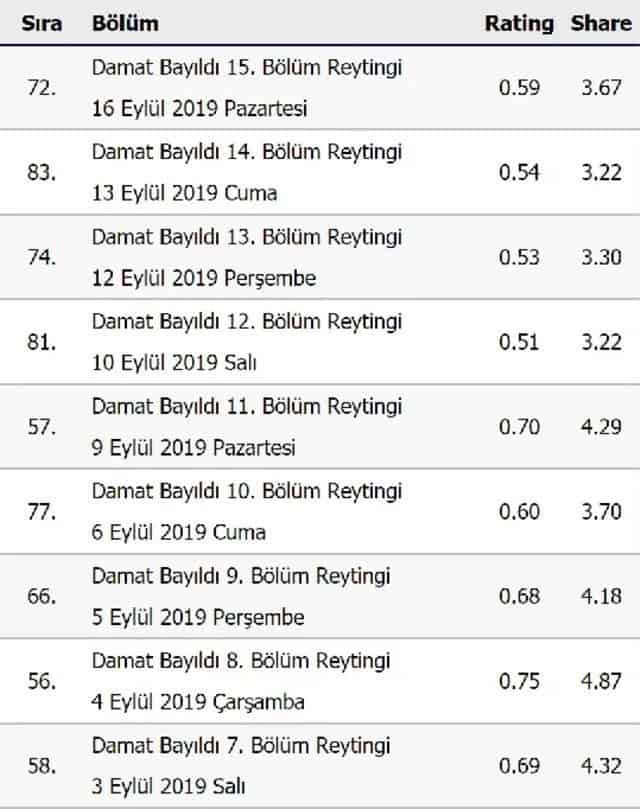 Kıyasıya mücadelenin yaşandığı programda kaynanaların yemek konusundaki engin tecrübeleri, gelinlerin el becerileri yarışırken damatlar annelerinin mi yoksa eşlerinin yemeklerini tanıyabilecek mi sorusunun yanıtı arandı. Yemekteyiz programının sunuculuğunu üstlenen ve bu program sayesinde çok sevilen tanınan Onur Büyüktopçu yeni programı Damat Bayıldı’dan beklediği performansı sağlayamadı. Büyük umutlarla yayın hayatına başlayan ve seyirciye kendini sevdirmeye çalışan Damat Bayıldı yarışması ne yaparsa yapsın bir türlü kendini sevdiremedi. Hal böyle olunca reytinglerde de büyük bir başarı gösteremedi. Reytinglerde kanalı ve yapım şirketini memnun edemeyen yemek yarışması için final kararı alındı. 26 Ağustos Pazartesi günü sezona başlayan Damat Bayıldı, final bölümüyle 18 Ekim Cuma 16.00'da ekranlarında olacak..