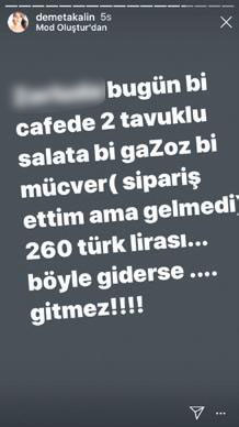 Şarkıcı Demet akalın geçtiğimiz günlerde yaşadığı bir olayı sosyal medya hesabı üzerinden paylaşınca bir anda gündemin ilk sıralarına yerleşti. Ünlü isim gittiği bir restorantta başına gelenleri ve uygulanan fiyat politikasını eleştirdi ve “Böyle gitmez” diyerek adeta isyan etti. Ünlü isim gittiği restorantta sipariş ettiği tavuklu salata, gazoz ve mücveri yedi ve ardından hesabı istedi. Ancak gelen hesapla adeta çok oldu. Ünlü isim gelen hesaba isyan etti ve iki tavuklu salata, bir gazoz ve bir mücverin 260 lira olduğuna inanamadı ve bu böyle gitmez diyerek tepki gösterdi. Olayı sosyal medya hesabından paylaşan Ünlü şarkıcı Demet Akalın “bugün bir kafede iki tavuklu salata, bir gazoz ve bir mücver 260 Türk Lirası! Böyle giderse… Gitmez” paylaşımını yaptı. Bu paylaşım takipçileri tarafından binlerce yorum ve beğeni alan demet Akalın aynı zamanda geçtiğimiz günlerde Bodrum’da uygulanan fiyat politikasını da eleştirmişti.
