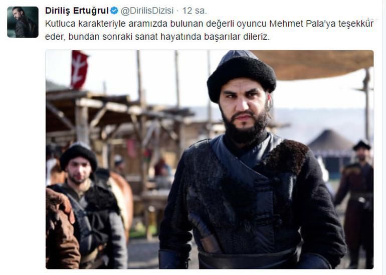 Ural Bey karakterine can veren Kürşat Alnıaçık'ın fenomen dizi Diriliş Ertuğrul'a veda etmesinin ardından Mehmet Pala da diziden ayrılan ikinci isim oldu. Dizide Ural bey, Çavdar Obası Beyi Aliyar'ın sağ kolu olan Kutluca'yı öldürdü. Dizinin twitter sayfasından paylaşılan gönderide 'Ural karakteri ile dizimizde yer alan değerli oyuncu Kürşat Alnıaçık'a emekleri için teşekkür eder, sanat hayatında başarılar dileriz.' notuna yer verildi. Bir diğer ayrılık için de 'Kutluca karakteri ile dizimizde yer alan değerli oyuncu Kürşat Alnıaçık'a emekleri için teşekkür eder, sanat hayatında başarılar dileriz.' denildi. Diriliş Ertuğrul'un yepyeni bölümlerini canlitv üzerinden TRT 1 canli izle kısmındanda takip edebilirsiniz.