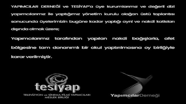 Kahramanmaraş merkezli yaşanan iki büyük deprem sonrası tüm ülke aynı acıda bir araya gelirken televizyon ve dijital yayın platformlarına içerik üreten yapımcılar bölge için ilk günden itibaren elinden geleni yapıyor. Geçtiğimiz hafta boyunca dizi setlerine ara verilmesinde öncü bir rol oynayan ve deprem bölgesine yardımlarda bulunan TESİYAP aynı zamanda bölgeye okul yaptırma kararı aldı. Yapılan açıklamada “Yapımcılar Derneği ve Televizyon ve Sinema Filmi Yapımcıları Meslek Birliği Yapımcılar Derneği’ne üye kurumlarımız ve değerli dizi yapımcılarımız ile yaptığımız yönetim kurulu olağan üstü toplantısı sonucunda üyelerimizin bugüne kadar yaptığı ayni ve nakdi katkıları dışında olmak üzere, yapımcılarımız tarafından yapılan nakdi bağışlarla, afet bölgesinde tam donanımlı bir okul yaptırılmasına oy birliğiyle karar verilmiştir” ifadeleri kullanıldı.