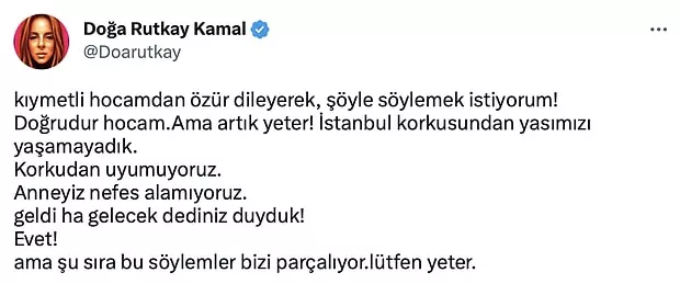 Kahramanmaraş'ta meydana gelen 7.7 ve 7.6 şiddetindeki depremler, 10 ilimizde ağır yıkımlara neden olurken ülke insanının da psikolojisini alt üst etti. Öyle ki %91’i deprem kuşağında yer alan ülkemizde vatandaş olası depremlerden korkmaya başladı. 10 gündür sürekli deprem özel yayını yapan kanallar, ekrana çıkarttığı deprem uzmanlarına olası İstanbul depremini soruyor. Hal böyle olunca İstanbul başta olmak üzere herkes haberlere isyan etmeye başladı. Katıldığı programda İstanbul'daki olası depremle ilgili konuşan Prof. Dr. Naci Görür’ün "500 bin insan ölümle burun buruna" demesi ise bardağı taşıran son damla oldu. İstanbullular adına ilk tepkiyi ortaya koyan Doğa Rutkay oldu. Artık yeter diyerek isyan bayrağı çeken iki çocuk annesi oyuncu Doğa Rutkay Kamal ise Görür'ün sözlerine şu cümlelerle tepki gösterdi. "KORKUDAN UYUYAMIYORUZ YETER. Kıymetli hocamdan özür dileyerek, şöyle söylemek istiyorum! Doğrudur hocam. Ama artık yeter! İstanbul korkusundan yasımızı yaşayamadık. Korkudan uyumuyoruz. Anneyiz nefes alamıyoruz. Geldi ha gelecek dediniz duyduk! Evet! ama şu sıra bu söylemler bizi parçalıyor. Lütfen yeter.”
