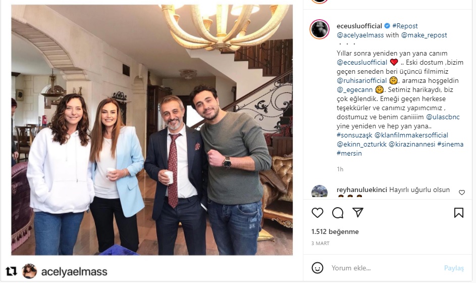 Ünlü oyuncu Ece Uslu Klan filmin imza attığı ‘Sonsuz Aşk’ filminde Ege Can’la başrolü paylaşıyor.