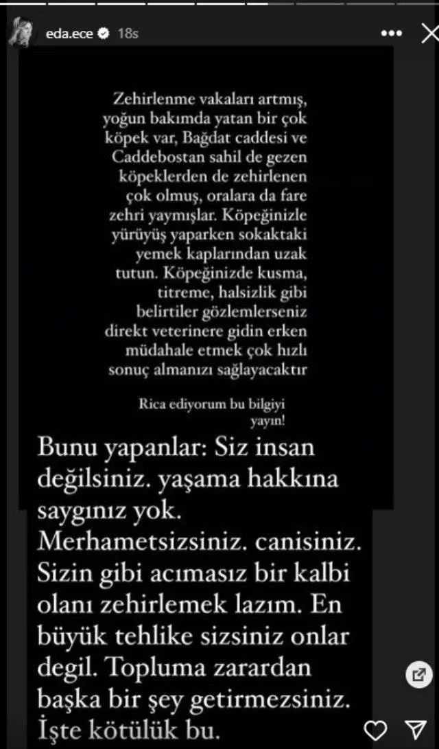Gözde Kaya’nın haklı tepkisine sessiz kalmayan Eda Ece zavallı hayvanların zehirlenme iddiasına şu sözlerle tepki gösterdi: "Bunu yapanlar; siz insan değilsiniz, yaşama hakkına saygınız yok. Merhametsizsiniz, canisiniz. Sizin gibi acımasız bir kalbi olanı zehirlemek lazım. En büyük tehlike sizsiniz, onlar değil. Topluma zarardan başka bir şey getirmezsiniz. İşte kötülük bu"