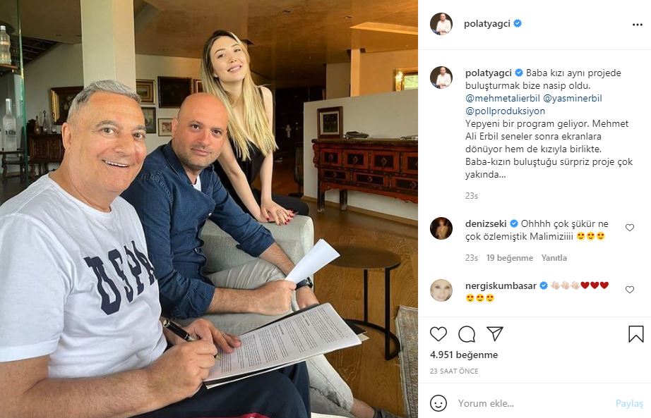 Uzun süredir ekranda olmayan Mehmet Ali Erbil ilk kez kızı ile birlikte bir programda olacak. Erbil'in sevenlerini sevindiren haberin ardından yapımcı Polat Yağcı da bir paylaşım yaptı. Poll Yapım Şirketi'nin sahibi Polat Yağcı, Yasmin Erbil ve Mehmet Ali Erbil'le çektirdiği fotoğrafı paylaşarak anlaşmayı duyurdu. Yağcı, "Baba kızı aynı projede buluşturmak bize nasip oldu. Yepyeni bir program geliyor. Mehmet Ali Erbil seneler sonra ekranlara dönüyor hem de kızıyla birlikte. Baba-kızın buluştuğu sürpriz proje çok yakında…" ifadelerini kullandı. Mehmet Ali Erbil ve Yasmin Erbil'in birlikte sunacağı Çarkıfelek programının hangi kanalda yayınlanacağı ise henüz netleşmedi. Ünlü baba kızın yeni programı yakında ekranda olacak…