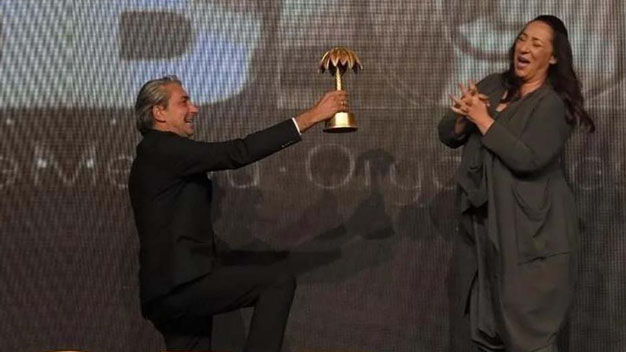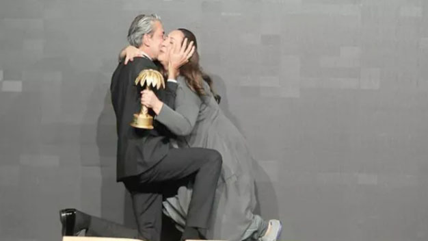 Yılın En İyi Kadın Dizi Oyuncusu seçilen usta oyuncu Binnur Kaya’ya Ödülünü Erkan Petekkaya verdi. Erkan Petekkaya Binnur Kaya’nın önünde diz çöktü.