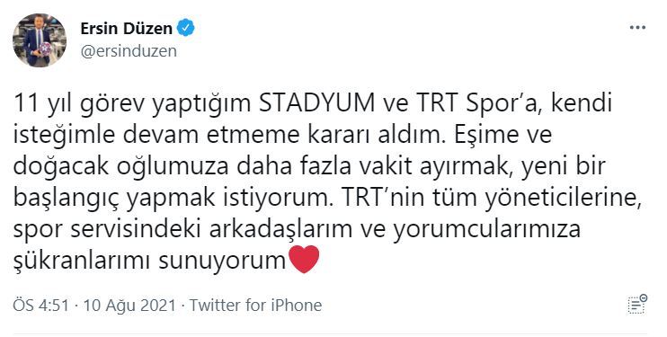 TRT ekranlarından seyirciyle buluşan Ersin Düzen sosyal medya hesabından bir paylaşım yaparak TRT'den ayrıldığını duyurdu. Başarılı programcı doğacak olan oğluna ve eşine daha çok zaman ayırmak istediğini belirtti. TRT yöneticileri ve çalışma arkadaşlarına teşekkür eden Düzen TRT'den kendi isteği ile ayrıldığını söyledi. Ersin Düzen o paylaşımında, "11 yıl görev yaptığım STADYUM ve TRT Spor’a, kendi isteğimle devam etmeme kararı aldım. Eşime ve doğacak oğlumuza daha fazla vakit ayırmak, yeni bir başlangıç yapmak istiyorum. TRT’nin tüm yöneticilerine, spor servisindeki arkadaşlarım ve yorumcularımıza şükranlarımı sunuyorum" ifadelerini kullandı.