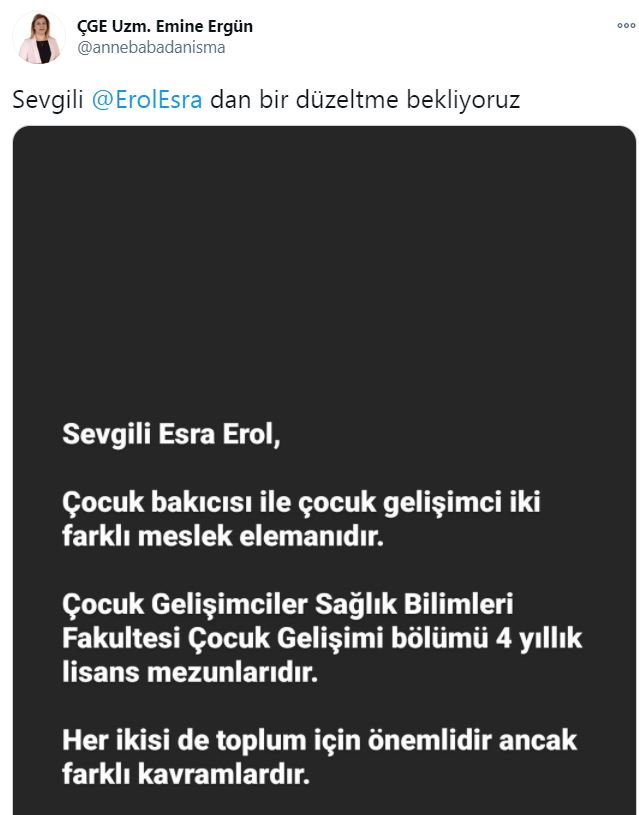 Emine Ergün Çocuk Gelişimi Merkezi uzmanlarından Emine Ergün de programda kullanılan ifadelerden dolayı sosyal medya hesabından bir açıklama yaptı. Emine Ergün, "Sevgili Esra Erol, çocuk bakıcısı ile çocuk gelişimci iki farklı meslek elemanıdır. Çocuk Gelişimciler, Sağlık Bilimleri Fakültesi Çocuk Gelişimi Bölümü 4 yıllık lisans mezunlarıdır. Her ikisi de toplum için önemlidir ancak farklı kavramlardır. Bir kişinin kolay kandırılıyor olması mesleği ile ilgili değildir. Bu anlamda çocuk gelişimciler ve çocuk bakıcıları sizden bir düzeltme bekliyor. Sevgiler" ifadelerini kullandı.