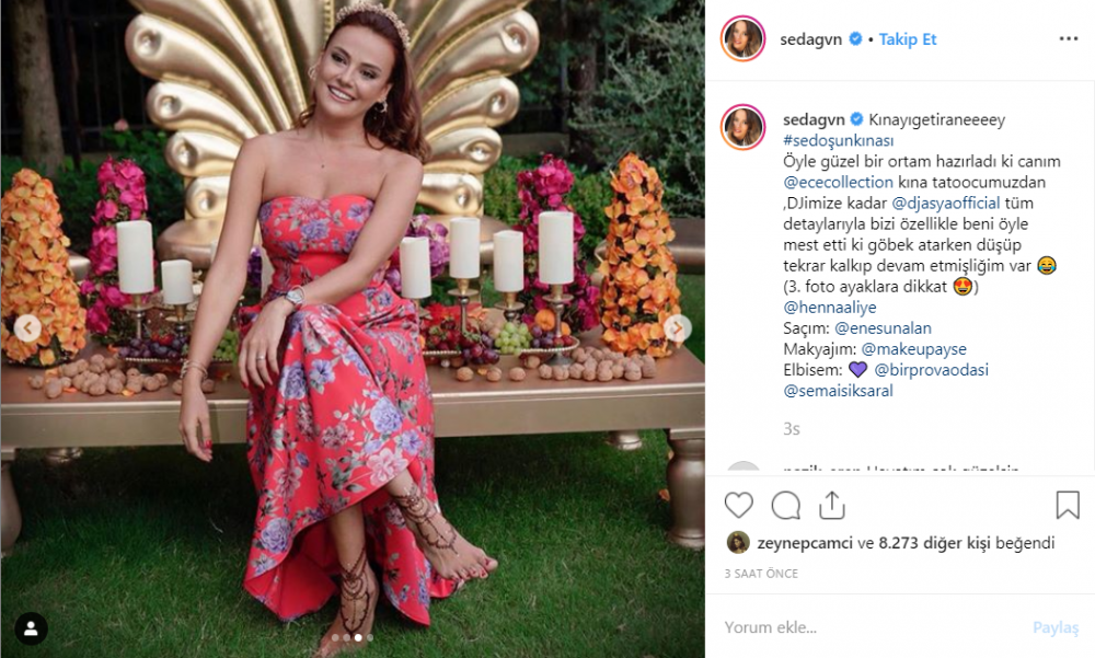 Ünlü oyuncu Seda Güven uzun süredir iş insanı Ali Güzel ile birlikteydi. Düğün öncesi sevgilisi ile Bodrum'da tatil yapan oyuncu dün akşam ailesinin ve yakın arkadaşlarını katıldığı bir kına gecesi düzenledi. Daha önce Keremcem ile kısa süreli bir evlilik sürdüren Güven, şimdi ise işinsanı sevgilisi Ali Güzel ile nikah masasına oturmak için gün sayıyor. Mutlu haberi sosyal medya hesabından paylaşan Seda Güven'in kına gecesinden görüntüler;