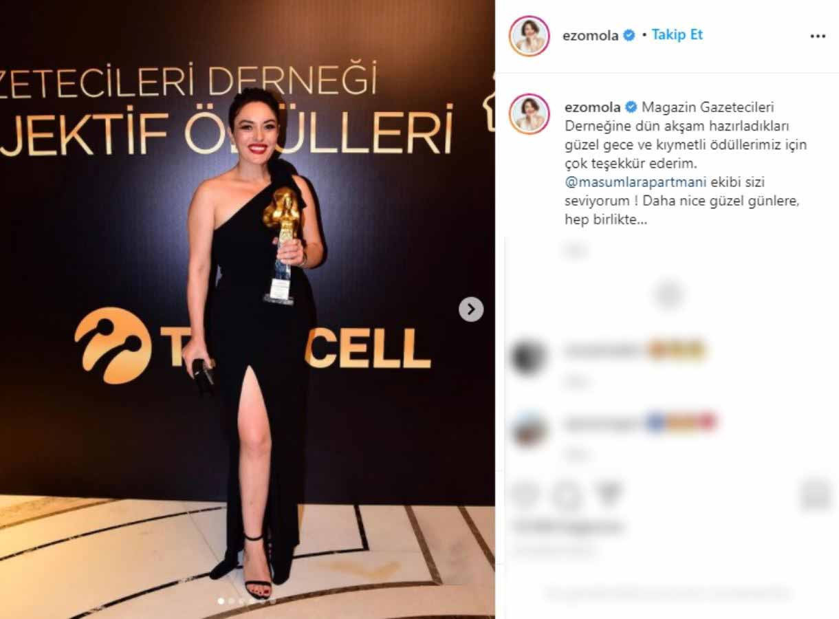 Ezgi Mola’nın bu anlamlı konuşması izleyiciler tarafından da büyük alkış alırken ünlü oyuncu bugün de kişisel sosyal medya hesabından ödül gecesine ait kareleri de sosyal medya hesabından paylaştı. Ezgi Mola sosyal medya hesabı Instagram’dan paylaştığı ödül gecesi fotoğraflarına şu notu düştü: “Magazin Gazetecileri Derneğine dün akşam hazırladıkları güzel gece ve kıymetli ödüllerimiz için çok teşekkür ederim. Masumlar Apartmanı ekibi sizi seviyorum ! Daha nice güzel günlere, hep birlikte…”