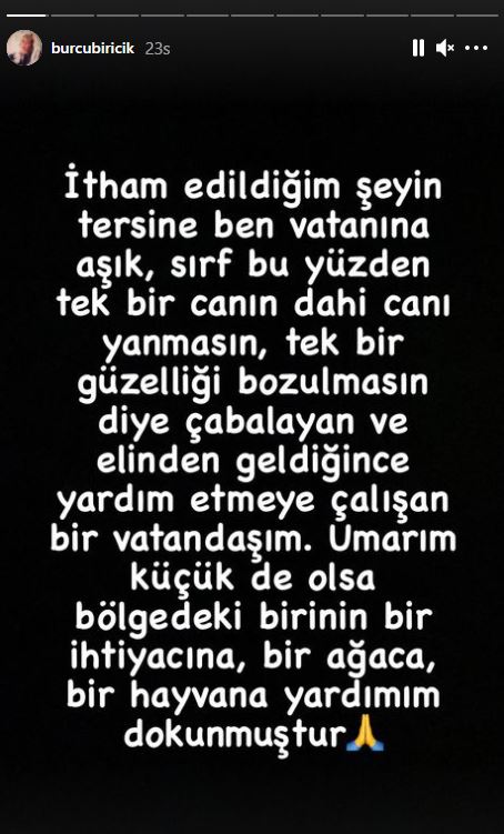 Kanal D'de yayınlanan Camdaki Kız dizisinin başrol oyuncusu Burcu Biricik yapılan habere sosyal medya hesabından paylaştığı storyle cevap verdi. Biricik, "İtham edildiğim şeyin tersine ben vatanına aşık, sırf bu yüzden tek bir canın dahi canı yanmasın, tek bir güzelliği bozulmasın diye çabalayan ve elinden geldiğince yardım etmeye çalışan bir vatandaşım. Umarım küçük de olsa bölgedeki birinin bir ihtiyacına, bir ağaca, bir hayvana yardımım dokunmuştur" ifadelerini kullandı.