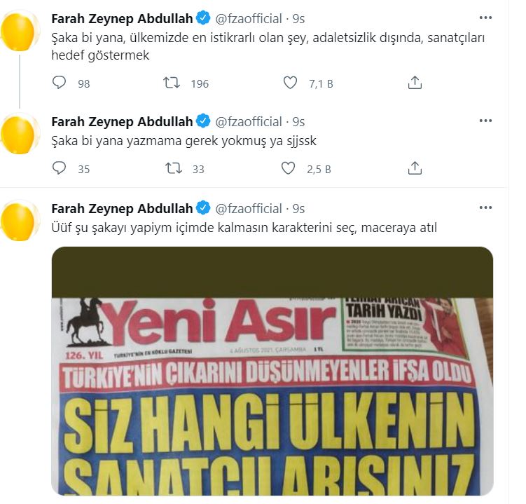 Gazete manşetinde yer alan bir diğer oyuncu ise Farah Zeynep Abdullah'dı. Abdullah da sosyal medya hesabından yaptığı paylaşımlarla hakkındaki iddialara tepki gösterdi. Ünlü oyuncu önce "Üüf şu şakayı yapiym içimde kalmasın karakterini seç, maceraya atıl" cümleleriyle birlikte gazete manşetini paylaştı. Olaya esprili bir dille yaklaşan Farah Zeynep Abdullah daha sonra, "Şaka bi yana, ülkemizde en istikrarlı olan şey, adaletsizlik dışında, sanatçıları hedef göstermek" mesajını paylaştı. Ünlü sanatçı bir süre sonra da "Şaka bi yana yazmama gerek yokmuş ya sjjssk" şeklinde bir paylaşım yaptı.