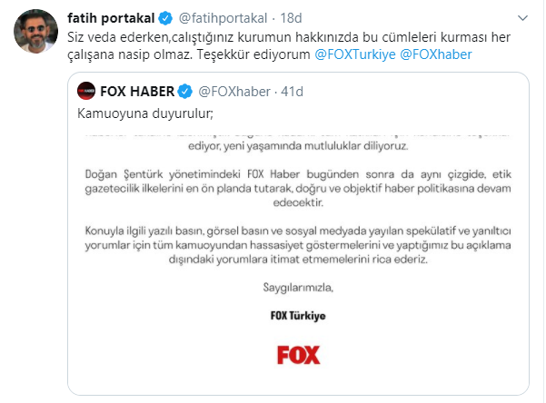 "FOX’un en önemli değerlerinden biri olmuştur." ifadesinin kullanıldığı açıklamayı sosyal paylaşım platformu Twitter hesabı üzerinden açıklama yapan Fatih Portakal, şu ifadeleri kullandı: "Siz veda ederken, çalıştığınız kurumun hakkınızda bu cümleleri kurması her çalışana nasip olmaz. Teşekkür ediyorum @FOXTurkiye @FOXhaber"