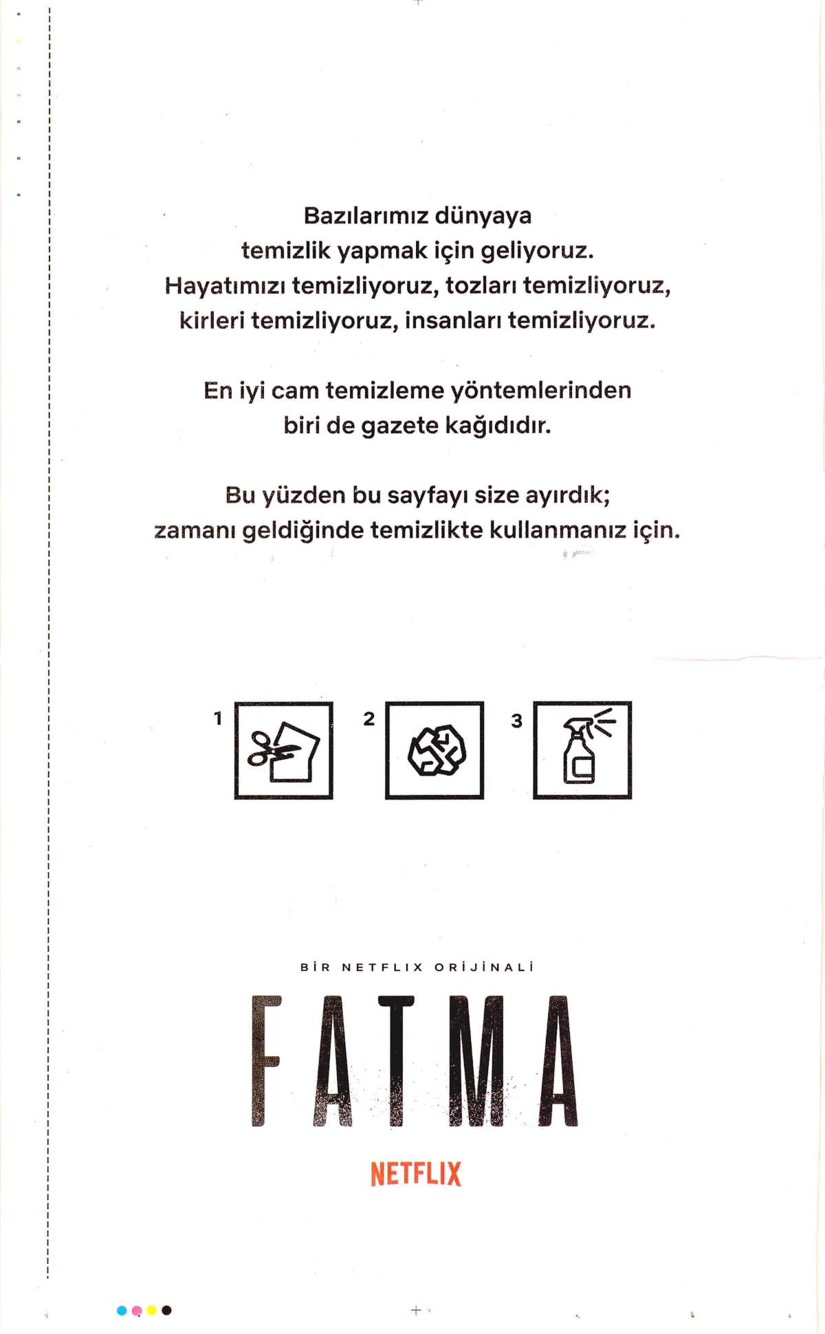 Hakan Muhafız, Bir Başkadır, Yeşilçam gibi dizilerle dizi sektöründeki yerini pekiştiren Netflix'in yeni Türk dizisi Fatma, yayına girdiği günden beri sosyal medyanın gündeminden düşmüyor. Başrollerini Burcu Biricik, Uğur Yücel ve Mehmet Yılmaz Ak'ın paylaştıkları Fatma dizisini Özgür Önürme kaleme alıyor. 27 Nisan Salı günü yayınlanan ilk bölümü izleyici tarafından beğenilen Fatma dizisi için Netflix Türkiye'nin gazetelere verdiği ilan yeni tartışmanın fitilini ateşledi. İşte o ses getiren ilandaki cümleler: "Bazılarımız dünyaya temizlik yapmak için geliyoruz. Hayatımızı temizliyoruz, tozları temizliyoruz, kirleri temizliyoruz, insanları temizliyoruz. En iyi cam temizleme yöntemlerinden biri de gazete kâğıdıdır. Bu yüzden bu sayfayı size ayırdık; zamanı geldiğinde temizlikte kullanmanız için."