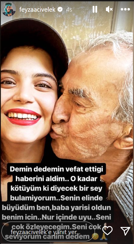 Şu sıralar Show Tv ekranlarında yayınlanan ve Gold Film tarafından hazırlanan sezonun başarılı dizilerinden olan Kızılcık Şerbeti’nde rol alan ve canlandırdığı Nilay karakteri ile dizide üstün bir performans ortaya koyan ve herkesin takdir ve beğenisini kazanan genç oyunculardan Feyza Civelek hayatının en acı günlerinden biri ile yüzleşti. Ünlü ve güzel oyuncu sosyal medya hesabından yaptığı paylaşımla dedesini kaybettiğini duyurdu. Aynı zamanda Kızılcık Şerbeti’nin senaristi de olan Melis Civelek’in kızı olan Feyza Civelek dizide canlandırdığı karakterle gündemde yer alıyor. Oyuncunun sosyal medya hesabından yaptığı paylaşım sevenleri ve takipçileri tarafından üzüntüyle karşılandı ve ünlü isme taziye mesajları geldi. Oyuncu baba yarısı dediği dedesinin ardından duygusal bir paylaşımda bulundu.