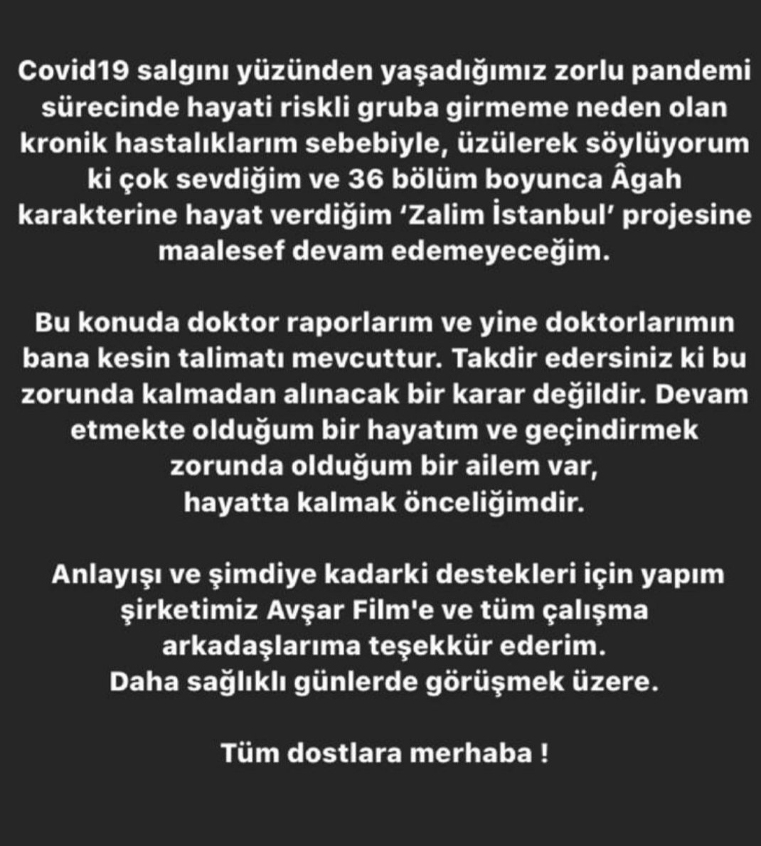 Fikret Kuşkan sosyal medya hesabından yaptığı açıklamada, "Covid- 19 salgını yüzünden yaşadığımız zorlu pandemi sürecinde hayati riskli gruba girmeme neden olan kronik hastalıklarım sebebiyle, üzülerek söylüyorum ki çok sevdiğim ve 36 bölüm boyunca Agah karakterine hayat verdiğim 'Zalim İstanbul' projesine maalesef devam edemeyeceğim" dedi.