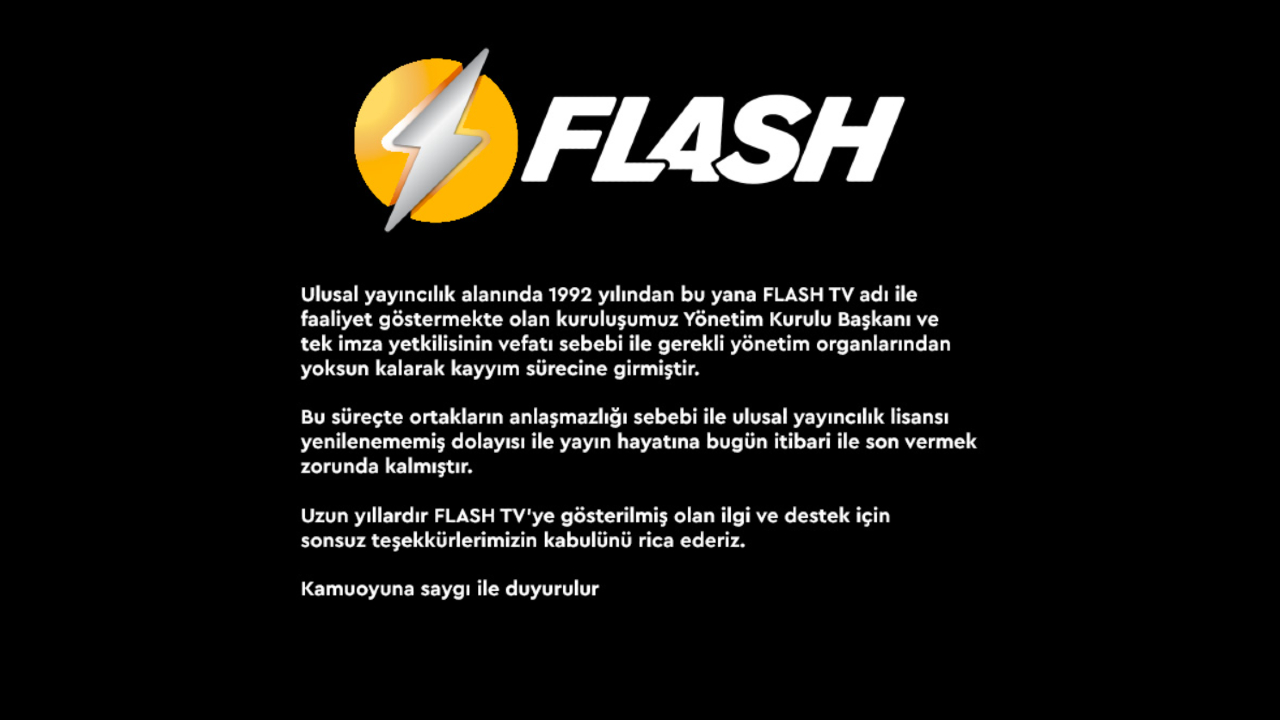 O açıklamada, "Ulusal yayıncılık alanında 1992 yılından bu yana FLASH TV adı ile faaliyet göstermekte olan kuruluşumuz Yönetim kurulu Başkanı ve tek imza yetkilisinin vefatı sebebi ile gerekli yönetim organlarından yoksun kalarak kayyım sürecine girmiştir. Bu süreçte ortakların anlaşmazlığı sebebi ile ulusal yayıncılık lisansı yenilenememiş dolayısı ile yayın hayatına bugün itibari ile son vermek zorunda kalmıştır. Uzun yıllardır FLASH TV’ye göstermiş olduğunuz ilgi ve destek için sonsuz teşekkürlerimizin kabulünü rica ederiz" ifadeleri kullanıldı.
