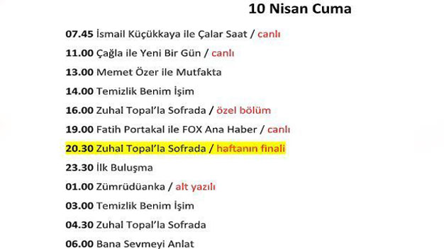 Fox Tv’nin başarılı yemek programı Zuhal Topal’la Sofrada Sofrada’nın final bölümü yarın akşam Fox Tv Ana Haberin ardından yayınlanacak ve kazanan belli olacak. Dizilerin yayın saatinin bir yemek yarışma programına verilmesi kanalın yayın politikasında nasıl bir değişikliğe yol açacak bunu zaman gösterirken programın alacağı reyting oranı da bunda belirleyici olacak. Ayrıca Zuhal Topal’la Sofrada Programı için de büyük bir şans olan bu kararın seyircide nasıl bir yansıması olacağını da yarından sonraki gün öğrenmiş olacağız. Bu gelişme sonrası televizyon kanallarının dizilere terk edilen prime time kuşağı yeniden programlara açılır mı bekleyip göreceğiz.