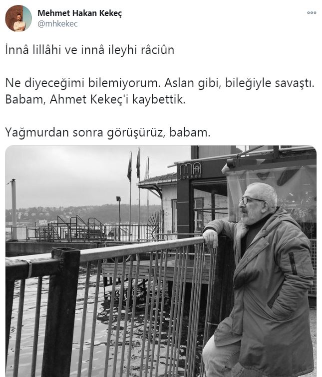 Koronavirüs sebebiyle vefat eden Ahmet Kekeç'in oğlu Mehmet Hakan Kekeç babasının vefat haberini sosyal medya hesabından paylaştı. Kendisinin de koronavirüs testinin pozitif çıktığını daha önce belirten Mehmet Hakan Kekeç, babasının ardından duygulandıran cümleler kurdu. Hakan Kekeç, "İnnâ lillâhi ve innâ ileyhi râciûn. Ne diyeceğimi bilemiyorum. Aslan gibi, bileğiyle savaştı. Babam, Ahmet Kekeç'i kaybettik. Yağmurdan sonra görüşürüz, babam" ifadelerini kullandı.