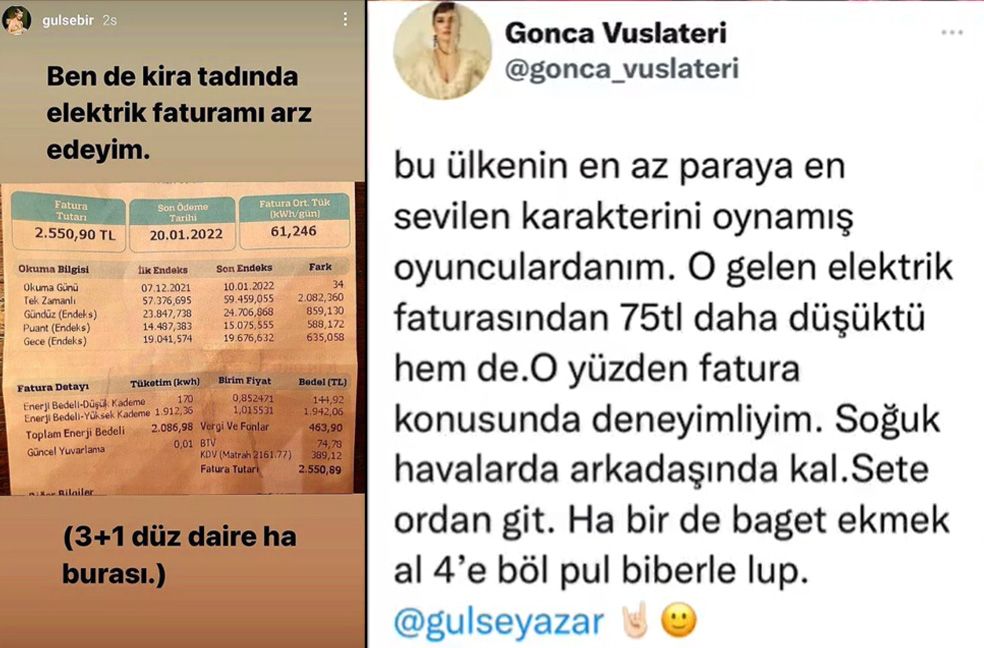Yalan Dünya dizisinin senaristi ve başrolü Gülse Birsel, gelen zamlara tepki göstermek amacıyla 2.550 TL'lik elektrik faturasını paylaşmıştı. Aynı dizide Vasfiye Teyze tiplemesi fenomene dönüşen Gonca Vuslateri, bu paylaşımın hemen ardından o dönem dizide aldığı düşük ücret nedeniyle Gülse Birsel'i eleştirmişti.
