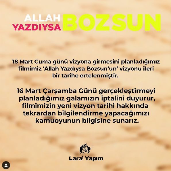 Film, 18 Mart ta vizyona girecekken ertelendi. Sosyal medyadan ertelendiğiini duyuran film yönetimi daha sonra Allah Yazdıysa Bozsun filminin vizyon tarihini açıkladı. Allah Yazdıysa Bozsun 13 Mayıs ta Vizyonda...