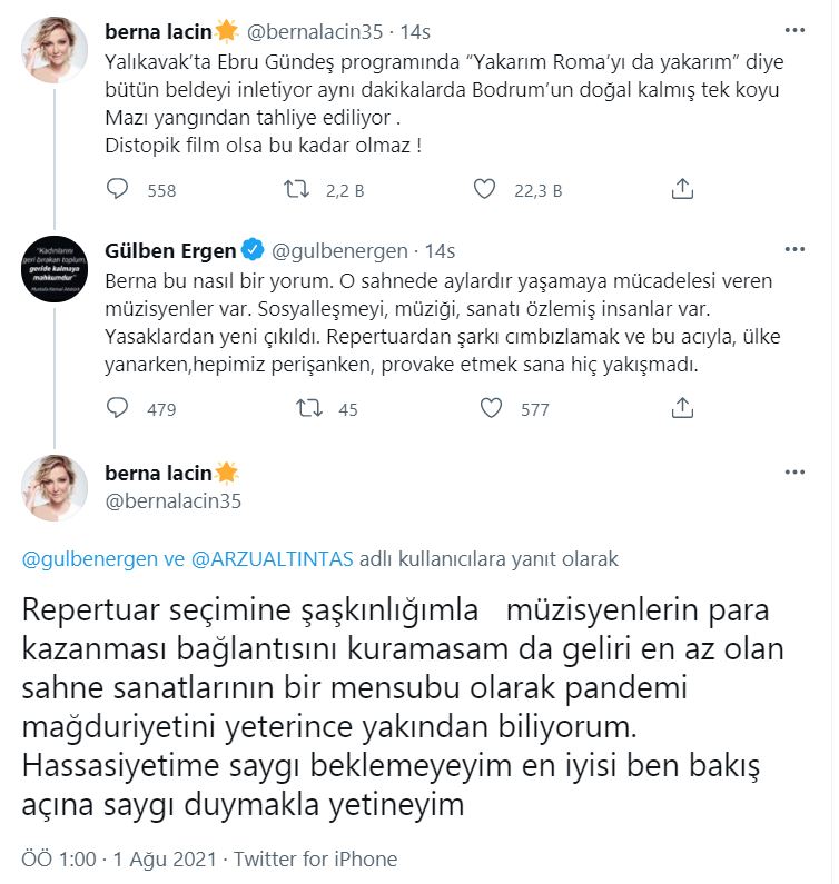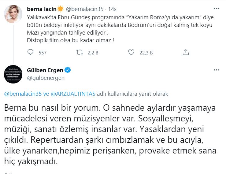 Gülben Ergen'in oldukça sert ifadeler içeren yorumuna Berna Laçin'den cevap gecikmedi. Laçin sosyal medya hesabından yaptığı paylaşımda, "Repertuar seçimine şaşkınlığımla müzisyenlerin para kazanması bağlantısını kuramasam da geliri en az olan sahne sanatlarının bir mensubu olarak pandemi mağduriyetini yeterince yakından biliyorum. Hassasiyetime saygı beklemeyeyim en iyisi ben bakış açına saygı duymakla yetineyim" ifadelerini kullandı. Gülben Ergen, Berna Laçin ve dolaylı olarak Ebru Gündeş isimleri arasında yaşanan polemik dikkatlerden kaçmadı. Ebru Gündeş'in Yalıkavak konserinde söylediği şarkı ile yangın bağlantısı kurulunca ortay böyle bir polemik çıktı. Öte yandan Bodrum'da süren yangınlar nedeniyle birçok alanda tahliye çalışmaları devam ediyor.