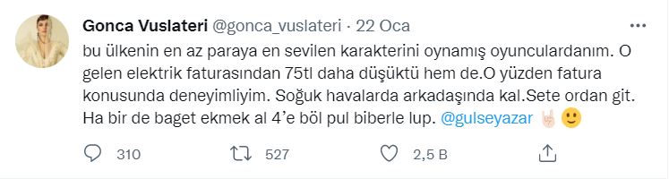 Gonca Vuslateri paylaşımında şu ifadeleri kullandı; "Bu ülkenin en az paraya en sevilen karakterini oynamış oyunculardanım. O gelen elektrik faturasından 75tl daha düşüktü hem de.O yüzden fatura konusunda deneyimliyim. Soğuk havalarda arkadaşında kal.Sete ordan git. Ha bir de baget ekmek al 4’e böl pul biberle lup." Vuslateri Gülse Birsel'i etiketlediği paylaşımı ise dikkat çekti. Gonca Vuslateri Yalan Dünya dizisinde Vasfiye Teyze karakteri ile çok sevilmişti.