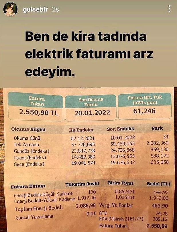 Elektrik zamlarının ardından gelen faturalar birçok kişinin gündemini oluştururken ünlü oyuncu Gülse Birsel'de bir paylaşım yaptı. Ünlü oyuncu ve yazar Gülse Birsel 2 bin 550 lira gelen elektrik faturasını paylaşınca sosyal medya kullanıcıları tarafından çok sayıda yorum yapıldı. Gülse Birsel 3+1 evine gelen faturayı paylaşınca sanatçının takipçileri tüketilen elektrik miktarı hakkında esprili mesajlar yazdı. Gülse Birsel'in eleştiri amaçlı yaptığı paylaşıma birçok farklı açıdan yaklaşım sergilenirken oyuncu Gonca Vuslateri'nden de çok konuşulacak bir yorum geldi.