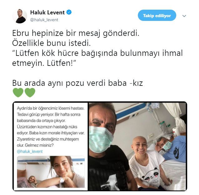 Baba Yılmaz Çelen ve Ebru ile fotoğraf çektiren başarılı sanatçı Haluk Levent, sosyal medya hesabı Twitter'da paylaşarak Ebru Çelen'in ''Kök hücre bağışında bulunmayı ihmal etmeyin!'' sözlerini takipçilerine iletti.