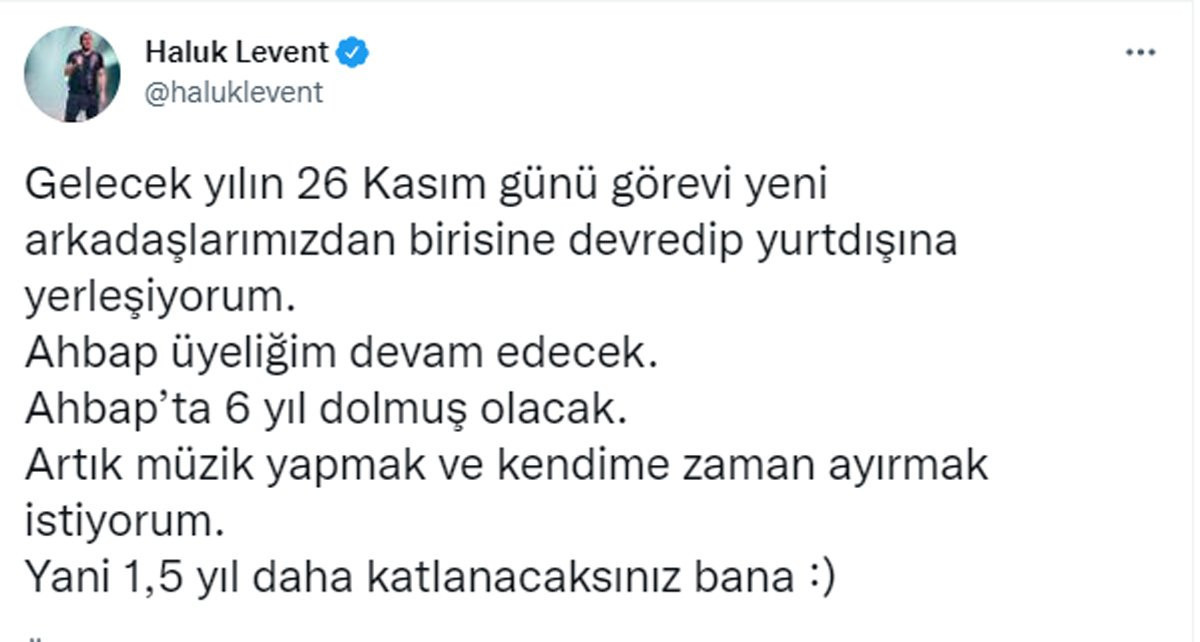 Kurucusu olduğu AHBAP platformunda yaptığı yardım ve paylaşımlarla 7'den 77'ye herkesin gönlünü fetheden ünlü sanatçı Haluk Levent sosyal medya hesabından yaptığı paylaşımla hayranlarını şok eden kararını bildirdi. İşte o karar: ""Gelecek yılın 26 Kasım günü görevi yeni arkadaşlarımızdan birisine devredip yurt dışına yerleşiyorum"