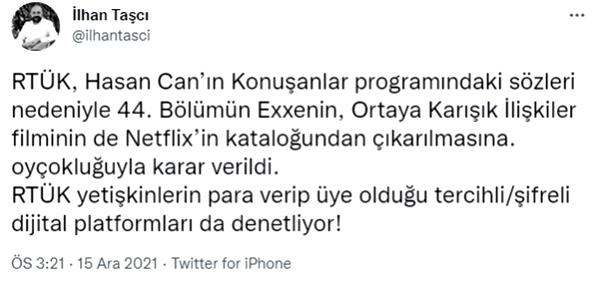 RTÜK tarafından yapılan açıklamada maksadı aşan ifadelerden dolayı kanalın cezalandırıldığı, sunucu Hasan Can Kaya’nın bir seyircinin ailesine küfür ettiğinin belirlendiği vurgulandı. İşte RTÜK tarafından yapılan o açıklama: "Programda mizahı aşan galiz ifadeler, bir yapımda ağza dahi alınmayacak söylemlerin bulunduğunu tespit edildi. Toplumun milli ve manevi değerlerine, genel ahlaka ve ailenin korunması ilkesine aykırı olamaz.' ve 'Türkçenin, özellikleri ve kuralları bozulmadan doğru, güzel ve anlaşılır şekilde kullanılmasını sağlamak zorundadır; dilin düzeysiz, kaba ve argo kullanımına yer verilemez.' hükümlerinin ihlal edildiği gerekçesiyle Exxen'e idari para cezası ve katalogdan çıkarma müeyyidesi uygulanmıştır.”