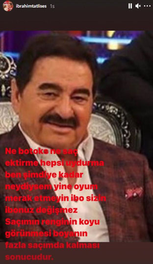 9 yıl aradan sonra yeniden başladığı İbo Show programının sevilen ismi ünlü türkücü İbrahim Tatlıses son günlerde hakkında çıkan estetik yaptırdı iddialarına sert çıktı. Ünlü isim sosyal medya hesabından bir paylaşım yaparak bütün bu iddialara yanıt verdi. İbrahim Tatlıses yaptığı paylaşımda “ne botoks ne saç ektirme… Hepsi uydurma… Ben şimdiye kadar neydiysem yine oyum. Merak etmeyin İbo sizin bildiğiniz İbo’nuz değişmez. Saçımın renginin koyu görünmesi boyanın fazla saçımda kalması sonucudur” ifadelerini kullandı. Ünlü türkücünün bu açıklaması sonrası estetik yaptırdığı iddiaları da en yetkili isim tarafından yalanlanmış oldu. Bütün bu iddialar da boşa çıkarak İbrahim Tatlıses’in estetik yaptırmadığı ve eskisi gibi olduğu öğrenildi.