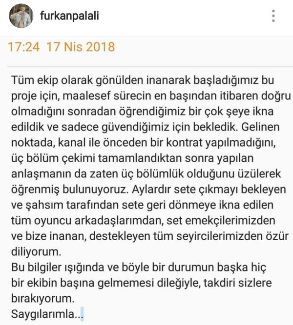 Tüm ekip olarak gönülden inanarak başladığımız bu proje için, maalesef sürecin en başından itibaren doğru olmadığını sonradan öğrendiğimiz bir çok şeye ikna edildik ve sadece güvendiğimiz için bekledik. Gelinen noktada, kanal ile önceden bir kontrat yapılmadığını, üç bölüm çekimi tamamlandıktan sonra yapılan anlaşmanın da zaten üç bölümlük olduğunu üzülerek öğrenmiş bulunuyoruz. Aylardır sete çıkmayı bekleyen ve şahım tarafından sete geri dönmeye ikna edilen tüm oyuncu arkadaşlarımdan, set emekçilerimizden ve bize inanan, destekleyen tüm seyircilerimizden özür diliyorum. Bu bilgiler ışığında ve böyle bir durumun başka bir ekibin başına gelmemesi dileğiyle, takdiri sizlere bırakıyorum