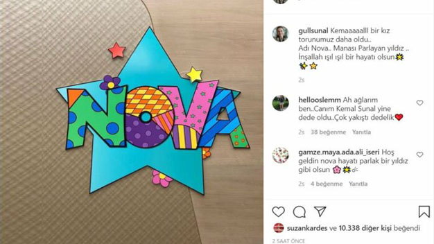 Ezo Sunal bebeğini sağlıklı bir şekilde dünyaya getirdikten sonra Ezo Sunal’ın annesi merhum Kemal Sunal’ın eşi Gül Suna da bir paylaşımda bulundu. Sevincini merhum eşiyle paylaşan Gül Sunal paylaşımında “Kemal bir kız torunumuz daha oldu. Adı Nova. Manası parlayan yıldız. İnşallah ışıl ışıl bir hayatı olsun” ifadelerini kullandı. Tüm aile bu mutluluğu coşkuyla yaşarken Ezo Sunal’ın sevenleri de bu coşkuya ortak oldu. Bizde Ezo Sunal ve Ömer Öztüyen çiftini tebrik ediyor ve Nova bebeğe de hoş geldin diyoruz. Umarız hayatı adı gibi olur ve her daim parıldayan ve huzurlu bir hayat sürer. İyi ki doğdun Nova bebek.