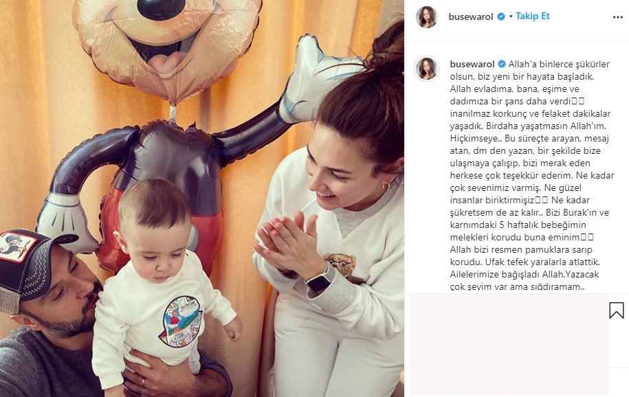 Alişan ve ailesimin önceki gün geçirdiği kaza sevenlerini üzmüştü. Buse Varol'un instagramdan yaptığı paylaşım ise Alişan hayranlarını sevindirdi. Kazadan sonra, eşi Alişan ve oğlu Burak ile instagram üzerinden bir paylaşım yapan Buse Varol şunları söyledi; "Allah'a binlerce şükürler olsun, biz yeni bir hayata başladık. Allah evladıma, bana, eşime ve dadımıza bir şans daha verdi. İnanılmaz korkunç ve felaket dakikalar yaşadık. Bir daha yaşatmasın Allah'ım. Hiç kimseye. Bu süreçte arayan, mesaj atan, DM'den yazan, bir şekilde bize ulaşmaya çalışıp, bizi merak eden herkese çok teşekkür ederim. Ne kadar çok sevenimiz varmış. Ne güzel insanlar biriktirmişiz. Ne kadar şükretsem de az kalır. Bizi Burak'ın ve karnımdaki 5 haftalık bebeğimin melekleri korudu buna eminim. Allah bizi resmen pamuklara sarıp korudu. Ufak tefek yaralarla atlattık. Ailelerimize bağışladı Allah.Yazacak çok şeyim var ama sığdıramam.Yanımızda olan herkesten Allah razı olsun."