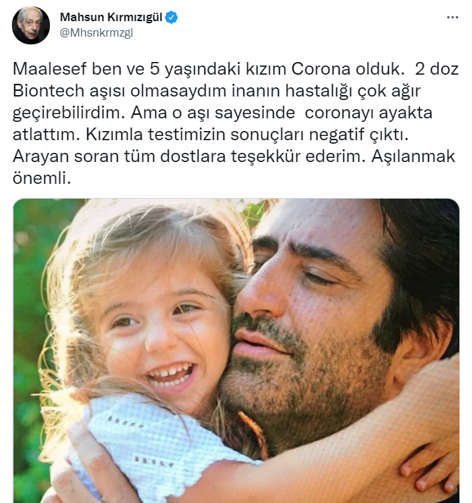Ünlü yapımcı, sağlık durumlarını merak eden hayranları için kişisel sosyal medya hesabı Twitter'dan yaptığı paylaşımda mühim bir tavsiyede bulundu: "Maalesef ben ve 5 yaşındaki kızım Corona olduk. 2 doz Biontech aşısı olmasaydım inanın hastalığı çok ağır geçirebilirdim. Ama o aşı sayesinde Korona'yı ayakta atlattım. Kızımla testimizin sonuçları negatif çıktı. Arayan soran tüm dostlara teşekkür ederim. Aşılanmak önemli."