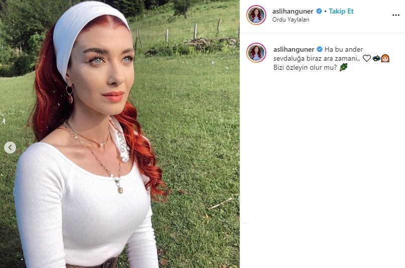 Dizinin başrol oyuncularından biri olan Aslıhan Güner, güzelliğini yansıtan bir fotoğrafla Kuzey Yıldızı İlk Aşk seyircilerine sosyal medydana veda etti. Güner paylaşımında, "Ha bu ander sevdaluğa biraz ara zamani…Bizi özleyin olur mu?" ifadelerini kullandı.