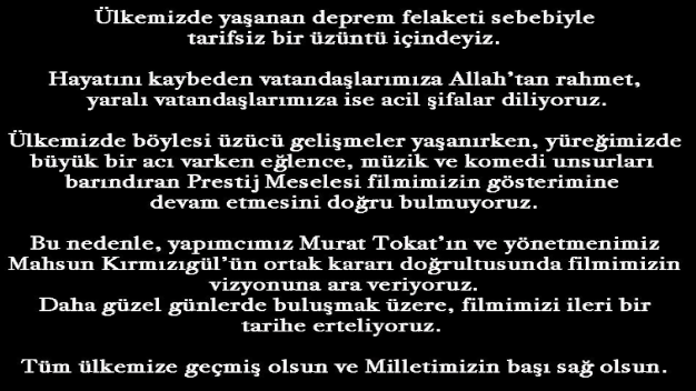 6 Şubat Pazartesi gecesi ve günü peş peşe yaşanan iki büyük depremin ardından ülkece zor günler yaşıyoruz. Bir hafta milli yas ilan edilen felaket dolayısıyla değişik kararlar hayata geçiriliyor. Televizyonlar yayınlarını deprem özel yayınına dönüştürürken bazı yapım şirketleri çekimlerini durdurdu. Son olarak Boyut Film de halen vizyonda olan ve yapımcılığını üstlendiği Prestij Meselesi Filmini vizyondan çekmeye karar verdi. Boyut Film yaptığı açıklamada “ülkemizde yaşanan deprem felaketi sebebiyle tarifsiz bir üzüntü içindeyiz. Hayatını kaybeden vatandaşlarımıza Allah’tan rahmet, yaralı vatandaşlarımıza ise acil şifalar diliyoruz. Ülkemizde böylesi üzücü gelişmeler yaşanırken, yüreğimizde büyük bir acı varken eğlence müzik ve komedi unsurları barındıran Prestij Meselesi filmimizin gösterime devam etmesini doğru bulmuyoruz. Bu nedenle yapımcımız Murat Tokat’ın ve yönetmenimiz Mahsun Kırmızıgül’ün ortak kararı doğrultusunda filmimizin vizyonuna ara veriyoruz. Daha güzel günlerde buluşmak üzere filmimizi ileri bir tarihe erteliyoruz. Tüm ülkemize geçmiş olsun ve milletimizin başı sağ olsun” ifadeleri kullanıldı.