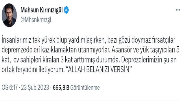 Kahramanmaraş merkezli yaşanan iki büyük deprem ve son olarak Hatay merkezli yaşanan depremlerle ülkemiz büyük bir felaket yaşarken ülke tek yürek olarak depremzedelere elinden geldiğince yardım etmeye çalışıyor. Ancak zaman zaman bu durumdan faydalanmak isteyenlerde oluyor. Depremin ilk gününden itibaren bölgede depremzedelere yardım etmeye çalışan Mahzun Kırmızıgül bu fırsatçılara sert sözlerle yüklendi. Mahzun Kırmızıgül sosyal medya hesabından yaptığı paylaşımda “insanlarımız tek yürek olup yardımlaşırken bazı gözü doymaz fırsatçılar depremzedeleri kazıklamaktan utanmıyorlar. Asansör ve yük taşıyıcıları 5 kat, ev sahipleri kiraları 3 kat arttırmış durumda. Depremzedelerimizin şu an ortak feryadını iletiyorum. Allah belanızı versin” ifadelerini kullandı.