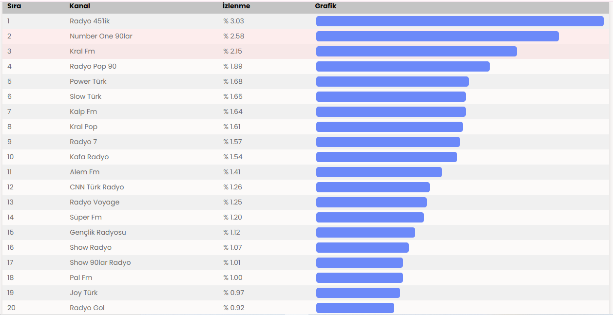Mart ayına ait radyo dinleme verileri, radyo dinleme alışkanlığının hâlâ güçlü bir şekilde devam ettiğini göstermiş oldu. Farklı tarzlarda yayın yapan radyo kanallarının listede yer alıyor olması, dinleyici kitlelerinin müzik tercihlerinin oldukça büyük bir alana yayıldığını gösteriyor. Elde edilen veriler, nostaljik şarkılardan pop müziği kadar geniş bir yelpazenin radyo dinleyicileri tarafından ilgiyle takip edildiğini ortaya koyarken, radyonun günlük yaşamda hâlâ güçlü ve vazgeçilmez bir yer edinmeye devam ettiğini gözler önüne seriyor.