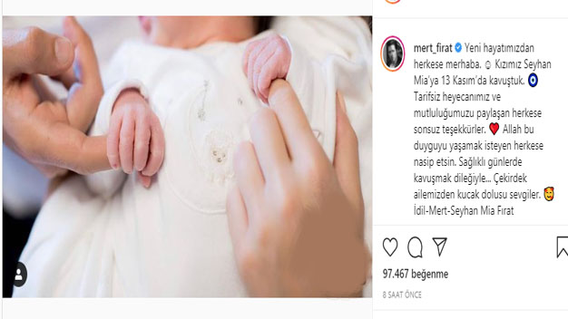 Ünlü oyuncular Mert ve İdil Fırat 2018 yılında evlendiler. Çiftin ilk bebekleri olan Seyhan Mia ise geçtiğimiz günlerde dünyaya geldi. Ünlü oyuncu Mert Fırat hastane çıkışı muhabirlere yaptığı açıklamada “çok acayip, hala tam olarak insan idrak edemiyor. Allah’tan çok güzel, sağlıklı bir bebek. Bir kız çocuğu” ifadelerini kullanmıştı. Dünyaya gelen bebeğin ilk fotoğrafı ise çift tarafından sosyal medya hesapları üzerinden bugün paylaşıldı. Mert Fırat paylaşımında Seyhan Mia bebeğin fotoğrafının yanında “yeni hayatımızdan herkese merhaba. Kızımız Seyhan Mia’ya 13 Kasım’da kavuştuk. Tarifsiz heyecanımız ve mutluluğumuzu paylaşan herkese sonsuz teşekkürler. Allah bu duyguyu yaşamak isteyen herkese nasip etsin. Sağlıklı günlerde kavuşmak dileğiyle. Çekirdek ailemizden kucak dolusu sevgiler. İdil – Mert – Seyhan Mia Fırat” ifadelerini kullandı.