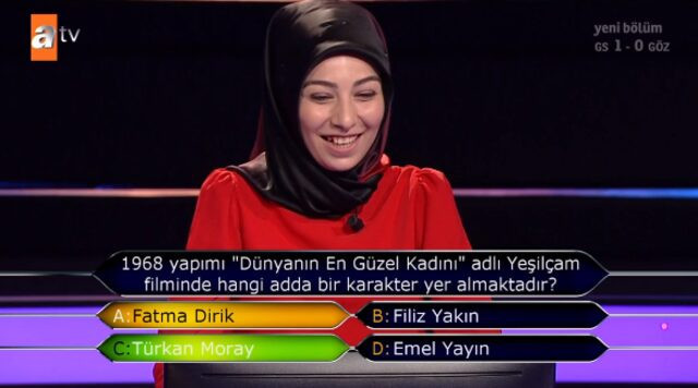 Yarışmacı Derya, şıklarda geçen Filiz Yakın, Fatma Dirik, Türkan Moray ve Emel Yayın isimlerini görünce ekran başındakiler gibi şaşırdı ve "bu isimler gerçek mi" diye sordu. Sunucu Kenan İmirzalıoğlu da gülerek "Gerçek olmayan bir şey sorulmaz burada" cevabını verdi. Genç yarışmacı risk almak istemeyerek yarışmadan çekildi ve 30 bin TL’lik çeki aldı. Gelelim "1968 yapımı 'Dünyanın En Güzel Kadını' adlı Yeşilçam filminde hangi adda bir karakter yer almaktadır?" sorusunun cevabına. Cevap Türkan Moray idi.