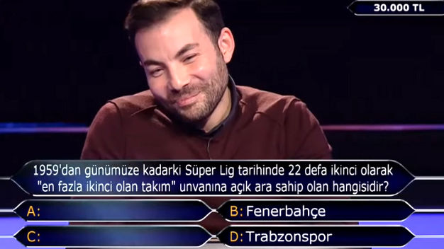 Galatasaraylı Kenan İmirzalıoğlu'nun sunduğu 'Kim Milyoner Olmak İster?' yarışmasında, yarışmacıya yöneltilen "1959'dan günümüze kadarki Süper Lig tarihinde 22 defa ikinci olarak en fazla ikinci olan takım unvanına açık ara sahip olan hangisidir?" sorusu tam 30000 lira değerindeydi. Yarışmacı teredütte kaldı. Joker hakkını kullanarak 2 şıkkın elenmesin istedi. Galatasaray ve Beşiktaş seçenekleri tahtadan silinince geriye Trabzon ve Fenerbahçe şıkları kaldı. Sorunun cevabı olarak en çok şampiyon olamasa da en çok ikincilik ipini göğüsleyen Fenerbahçe seçeneğini işaretleyen yarışmacı Serkan Bey soruyu bildi.